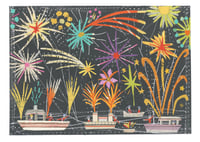 A giclee print from the original sold artwork, of the Queen floating down the Thames with fireworks on her jubilee