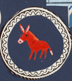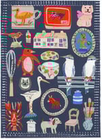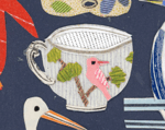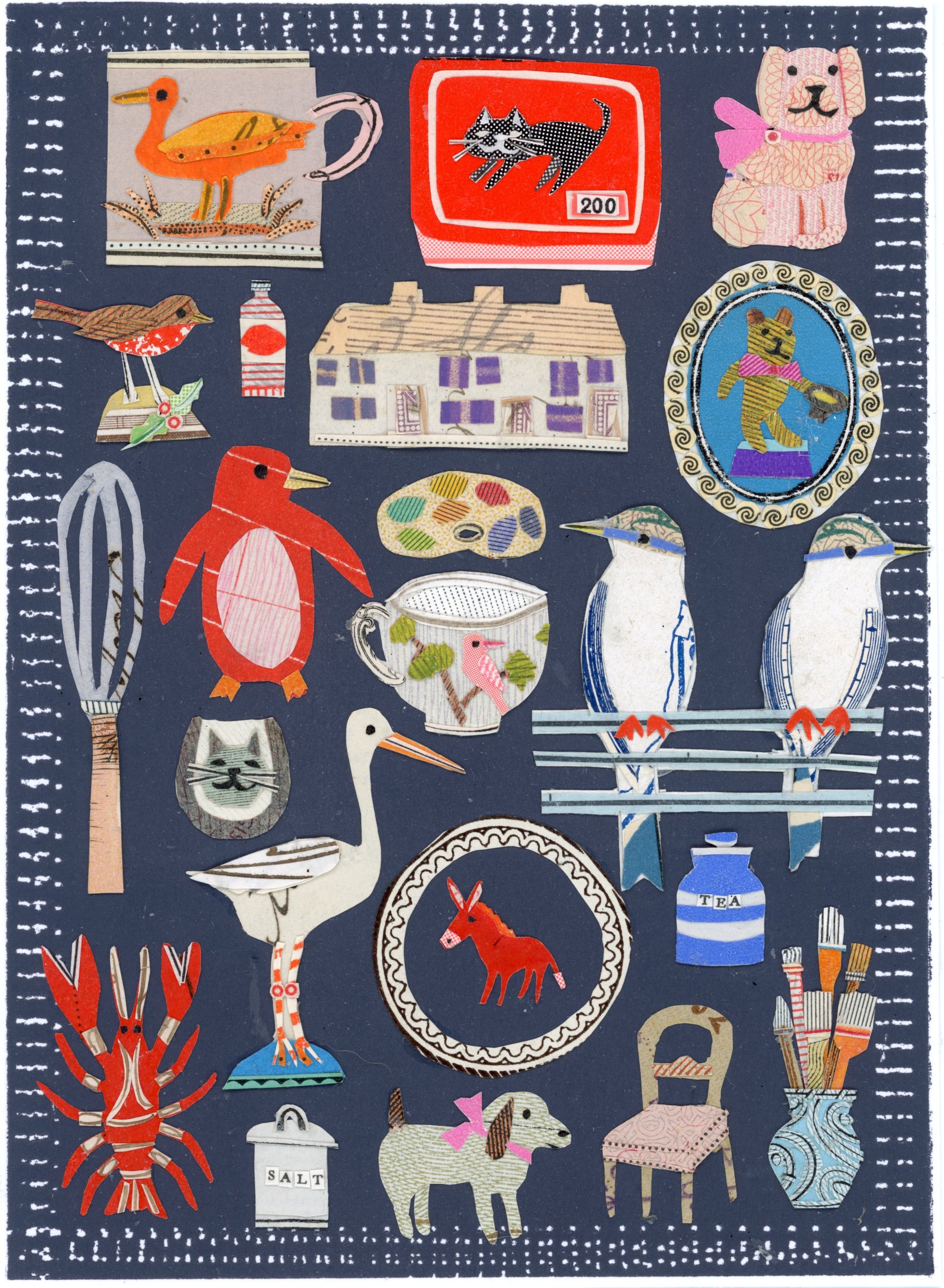 the cutouts are collaged onto a printed background with a dotty outline.