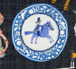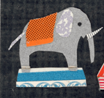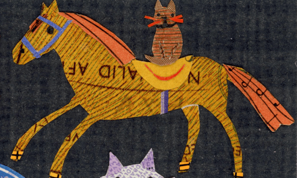 The cutouts are collaged onto a printed collaged background , with a tiny white border and no dotty border
